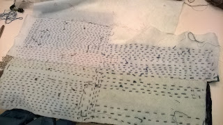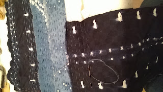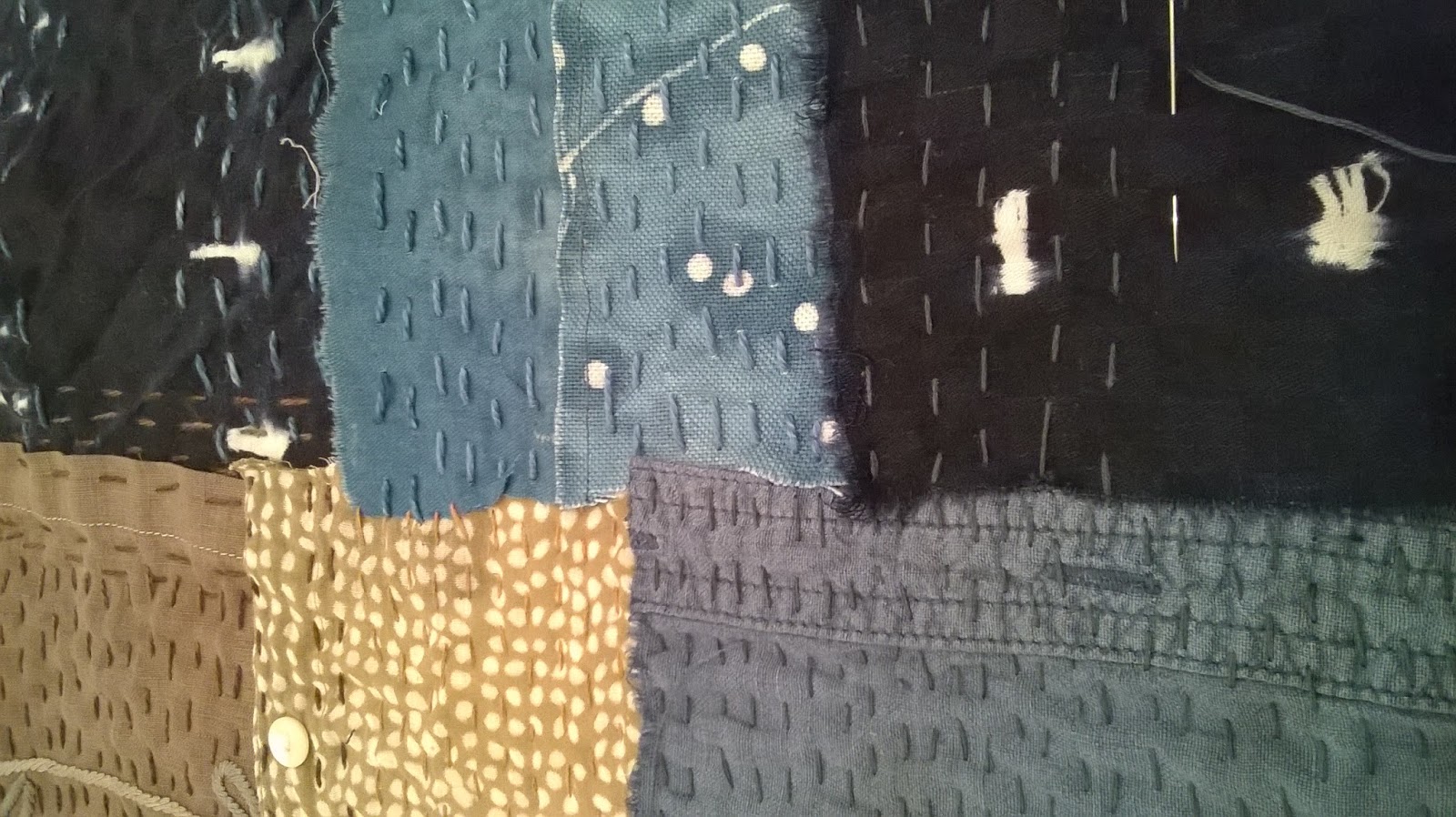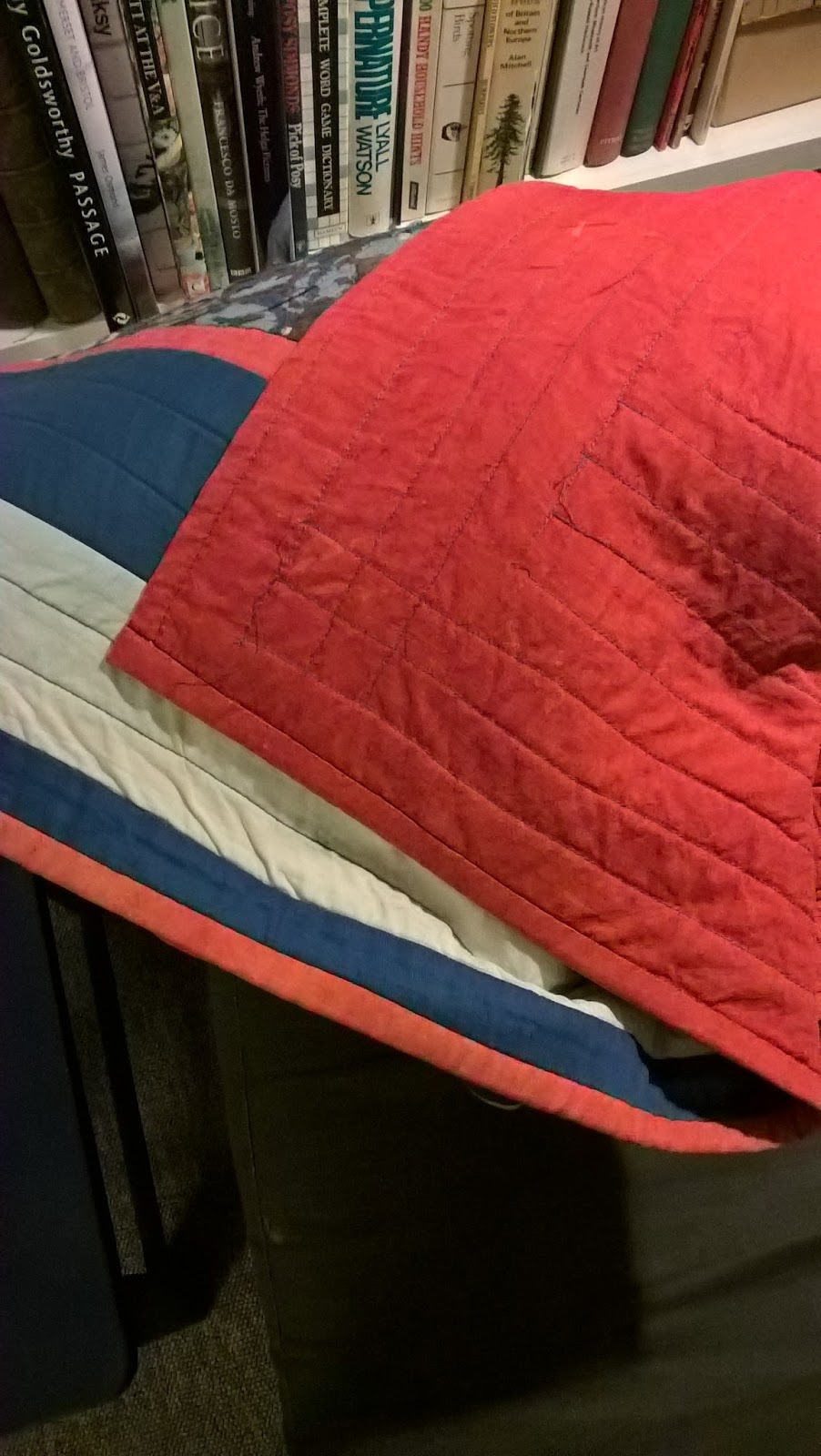 My make-do-and-mend personality is demonstrated by the backing fabric of this quilt. Once upon a time it was a yellow bed-sheet. Back in the day Habitat had fantastic deep-dyed bedlinen and we had two duvet and sheet sets in bright yellow and royal blue. Over time they wore out and went out of fashion (not necessarily in that order), but I still had a yellow sheet available for the dye-bath when I wanted to finish this quilt about ten years ago.